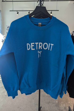 Introducing the Detroit Bow Pullover Sweatshirt. Made with high-quality materials, this stylish sweatshirt features a unique bow design and is perfect for adding a touch of urban flair to your wardrobe. With its comfortable fit and trendy look, it's the perfect addition to any fashion-forward outfit. Elevate your style with the Detroit Bow Pullover Sweatshirt.