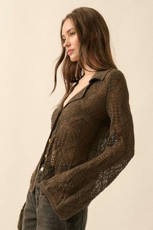 Elevate your style with the Chocolate Crochet Button Down Top, blending delicate craftsmanship and effortless charm. This breathable, intricately crocheted piece offers a flattering fit with button-down ease, perfect for layering or showcasing as a standout look. Ideal for warm days or cozy evenings, it adds a warm, rich tone to any outfit, ensuring you look stylish and feel comfortable all day long.